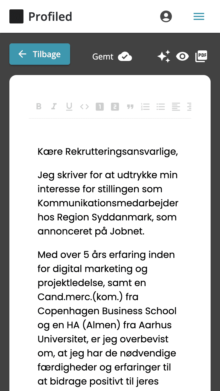 Vores AI-assisterede ansøgningseditor bruger dit CV og målrettede jobopslag til automatisk at skabe relevante og professionelle udkast. Systemet tilpasser indhold, tone og struktur, så teksten matcher den konkrete stilling. Efter generering kan du redigere videre, tilpasse sprog og eksportere det færdige materiale.